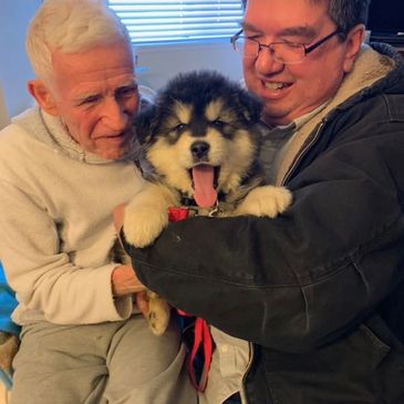 Axel is over a year old and has the personality that everyone loves. He still likes getting puppy massages with everyone being his friend.